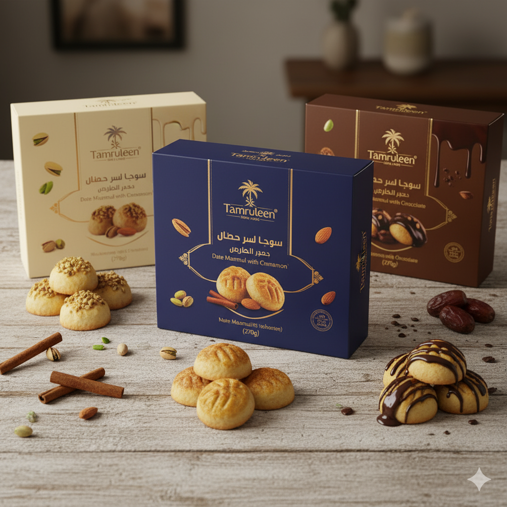 - معمول تمر بالقرفة (270 جم): نكهة تقليدية مع لمسة عصرية، مثالي للعيد أو الضيافة.