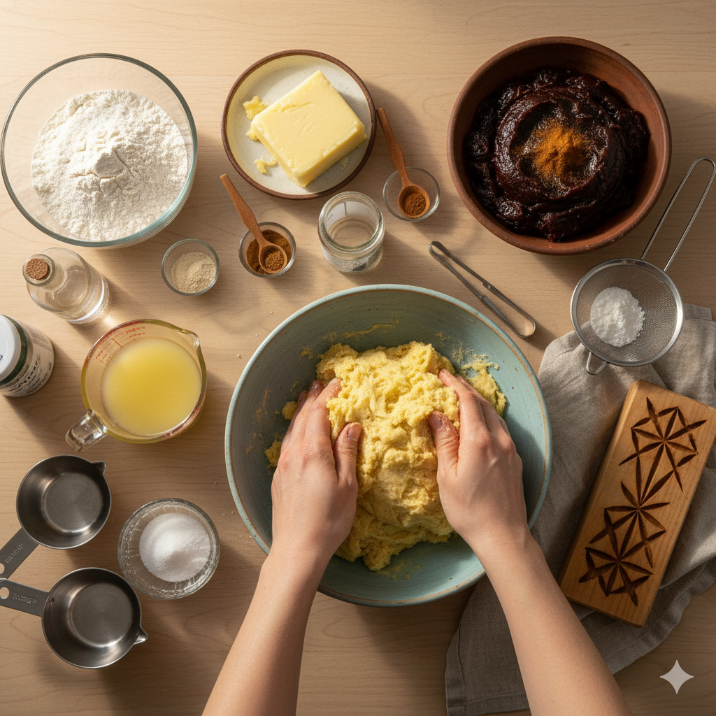 - تحضير العجينة: اخلط الدقيق، السمن، السكر، والمحلب حتى تتكون عجينة ناعمة. أضف ماء الورد تدريجيًا واترك العجينة ترتاح لساعة.