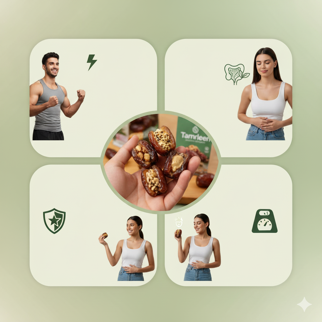 ثانيًا، دعم الهضم والشبع: الألياف في التمور تساعد في تعزيز الهضم ومنع الإمساك، كما أوضح موقع تمور المزروعي. بالنسبة للشباب الذين يعانون من الجوع المتكرر، فإن التمور المحشية بالسمسم أو الطحينة توفر شعورًا بالشبع يدوم، مما يقلل من السعرات اليومية. دراسة من Instagram Vitamino أكدت أن التمر المحشي بزبدة الجوز يحتوي على أوميغا 3 لصحة القلب والدماغ.